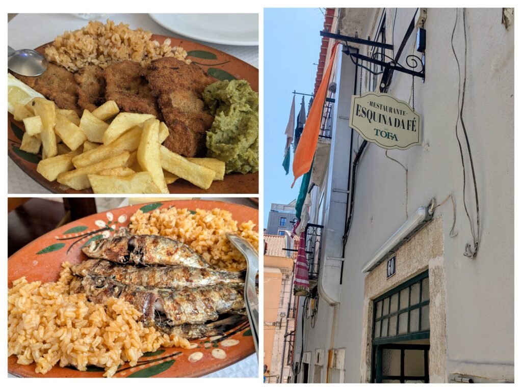 We ordered Panadinhos de Peru, or the tastiest ‘schnitzel’ I’ve ever had (and I live in Austria!). What made it stand out was the spicing in the breadcrumb coating, which elevated the dish to something far more interesting than its more famous alpine cousin. We also ordered grilled fish with tomato rice, which was equally satisfying. Each main dish cost just 11 EUR. Dessert was a brilliant (albeit rather functional looking!) lemon mousse, and a creme caramel style pudding. All in, we enjoyed a brilliant two course lunch for two for just 20 EURO!