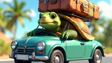a cartoon tortoise riding on a moped wearing a red helmet with a sunset behind overlooking a beach scene